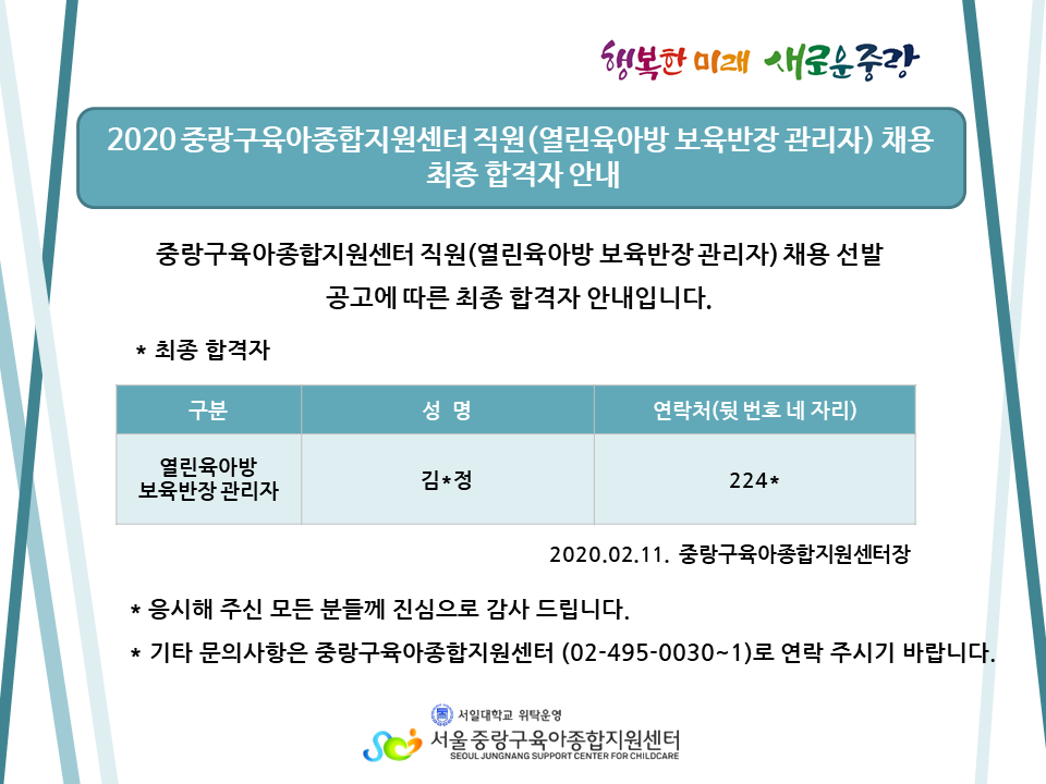 2020-02-11 6998 ¿¸°À°¾Æ¹æ º¸À°¹ÝÀå °ü¸®ÀÚ Ã¤¿ë ÃÖÁ¾ ÇÕ°ÝÀÚ ¾È³» ÀÌÀü±Û 2020³âµµ º¸À° »õÇбâ Àüȯ ¾÷¹«¸Å´º¾ó ¹× ±³À° ¿µ»ó ÆÄÀÏ È®ÀÎ ¹æ¹ý ¾È³» ´ÙÀ½±Û [¼¿ïƯº°½Ã ½Ä»ýȰÁ¾ÇÕÁö¿ø¼¾ÅÍ] "ÀåíýÇÏ´Ù ³»Àλý" ÇÁ·Î±×·¥ ¾È³» ¸ñ·Ï