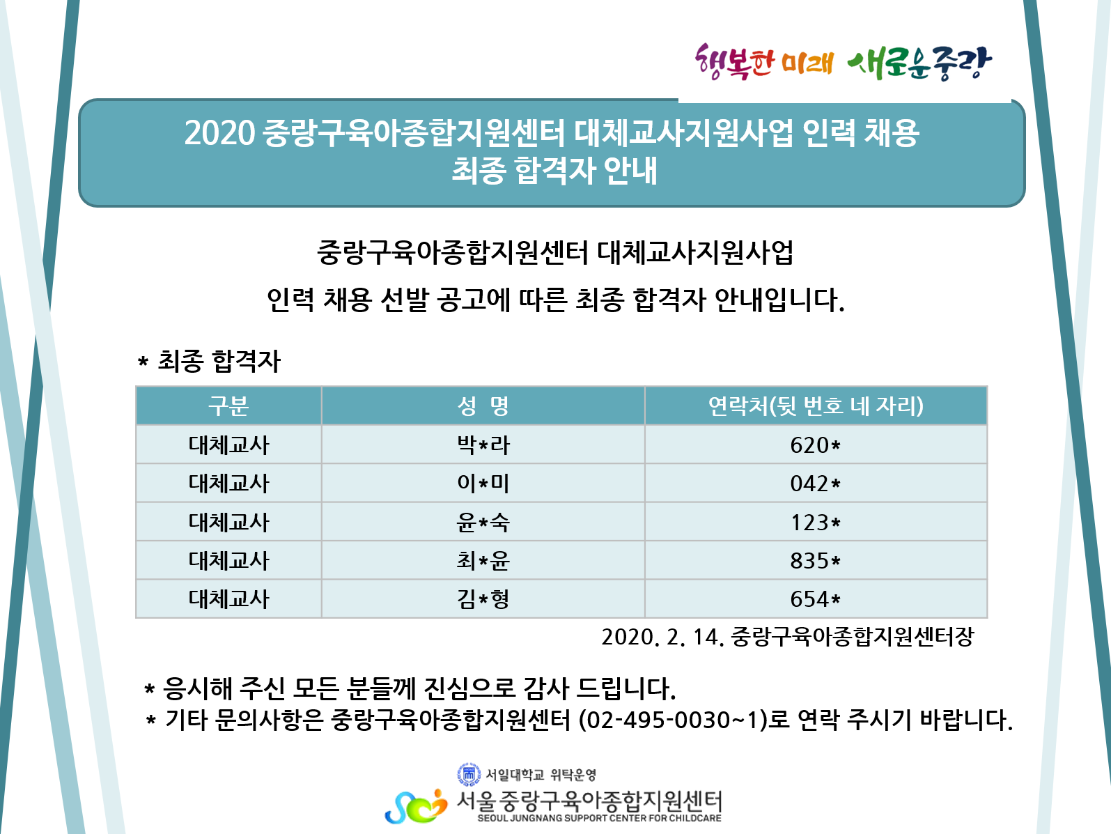 2020-02-14 7172 ´ëü±³»ç ä¿ë ÃÖÁ¾ ÇÕ°ÝÀÚ ¾È³» ÀÌÀü±Û [¼¿ïƯº°½Ã ½Ä»ýȰÁ¾ÇÕÁö¿ø¼¾ÅÍ] "ÀåíýÇÏ´Ù ³»Àλý" ÇÁ·Î±×·¥ ¾È³» ´ÙÀ½±Û ´ëüÁ¶¸®¿ø ä¿ë ÃÖÁ¾ ÇÕ°ÝÀÚ ¾È³» ¸ñ·Ï