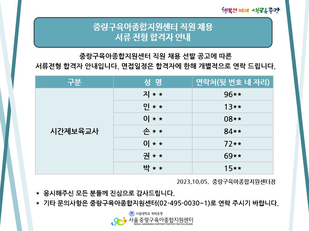 2023-10-05 6848 Áß¶û±¸À°¾ÆÁ¾ÇÕÁö¿ø¼¾ÅÍ Á÷¿ø(½Ã°£Á¦º¸À° ±³»ç) ¼·ùÀüÇü ÇÕ°ÝÀÚ ¾È³» ÀÌÀü±Û 10¿ù ã¾Æ°¡´Â ³îÀÌÅ丮 ÇÁ·Î±×·¥ ÀÏÁ¤º¯°æ ¾È³» ´ÙÀ½±Û Áß¶û±¸À°¾ÆÁ¾ÇÕÁö¿ø¼¾ÅÍ Á÷¿ø(½Ã°£Á¦º¸À° ±³»ç) ÃÖÁ¾ÇÕ°ÝÀÚ ¾È³» ¸ñ·Ï