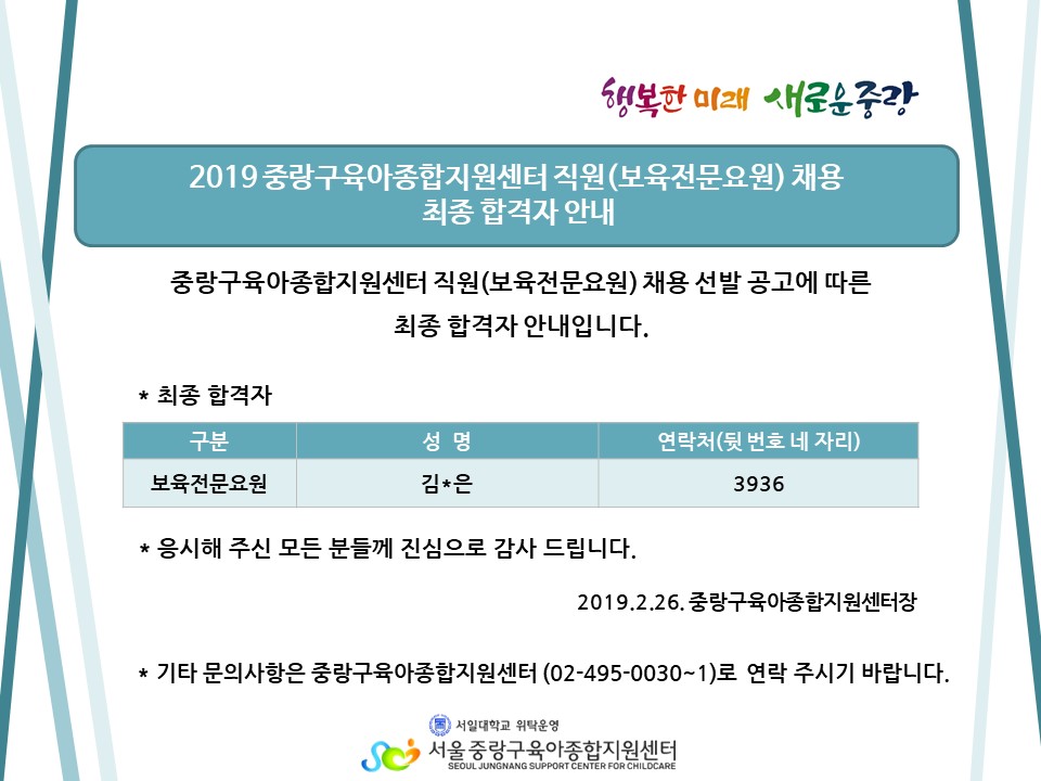 2019-02-26 6419 Áß¶û±¸À°¾ÆÁ¾ÇÕÁö¿ø¼¾ÅÍ Á÷¿ø(º¸À°Àü¹®¿ä¿ø) ä¿ë ÃÖÁ¾ ÇÕ°ÝÀÚ ¾È³» ÀÌÀü±Û »óºÀŰ¿ò °øµ¿À°¾Æ¹æ °³¼Ò ¾È³» ´ÙÀ½±Û Æò°¡Á¦ °á°ú¹ßÇ¥(11¿ù) ¸ñ·Ï