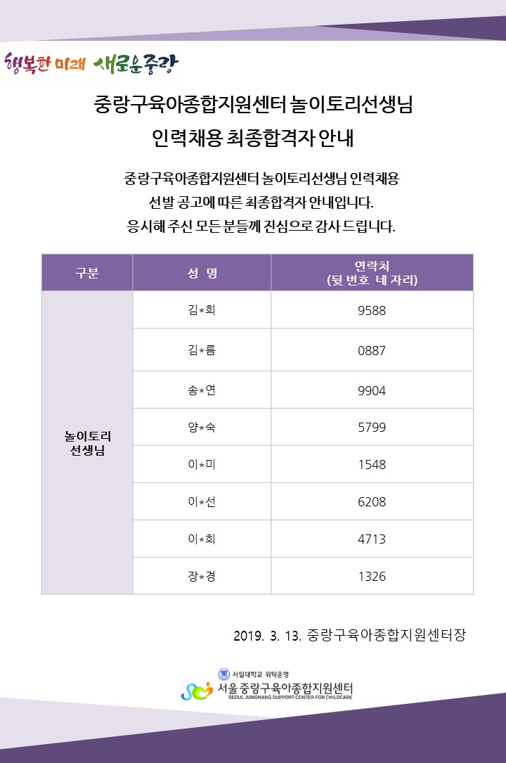 2019-03-13 10070 Áß¶û±¸À°¾ÆÁ¾ÇÕÁö¿ø¼¾ÅÍ ³îÀÌÅ丮¼±»ý´Ô ä¿ë ÃÖÁ¾ ÇÕ°ÝÀÚ ¾È³» ÀÌÀü±Û »óºÀŰ¿ò °øµ¿À°¾Æ¹æ °³¼Ò ¾È³» ´ÙÀ½±Û Æò°¡Á¦ °á°ú¹ßÇ¥(11¿ù) ¸ñ·Ï