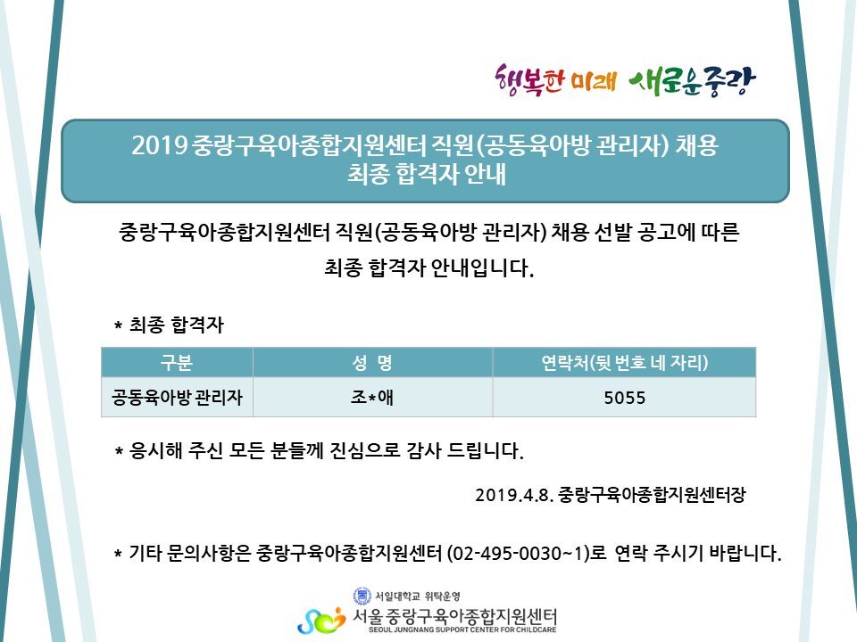 2019-04-08 6488 Áß¶û±¸À°¾ÆÁ¾ÇÕÁö¿ø¼¾ÅÍ Á÷¿ø(°øµ¿À°¾Æ¹æ °ü¸®ÀÚ) ä¿ë ÃÖÁ¾ÇÕ°ÝÀÚ ¾È³» ÀÌÀü±Û »óºÀŰ¿ò °øµ¿À°¾Æ¹æ °³¼Ò ¾È³» ´ÙÀ½±Û Æò°¡Á¦ °á°ú¹ßÇ¥(11¿ù) ¸ñ·Ï