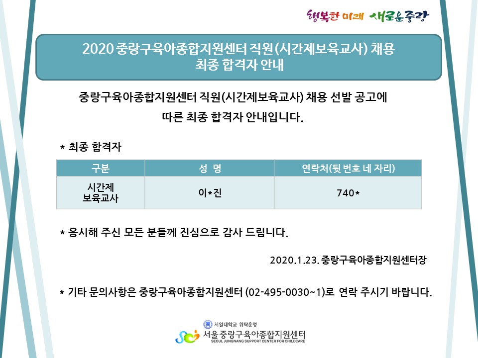 2020-01-23 7068 ½Ã°£Á¦º¸À°±³»ç ÃÖÁ¾ ÇÕ°ÝÀÚ ¾È³» ÀÌÀü±Û Æò°¡Á¦ °á°ú¹ßÇ¥(11¿ù) ´ÙÀ½±Û ¿¸°À°¾Æ¹æ º¸À°¹ÝÀå °ü¸®ÀÚ Ã¤¿ë ¼·ù ÀüÇü ÇÕ°ÝÀÚ ¾È³» ¸ñ·Ï