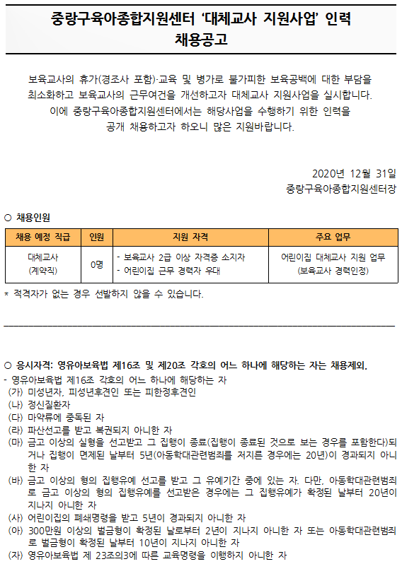 2020-12-31 7044 2021³â ´ëü±³»ç ä¿ë ¸ðÁý°ø°í ÷ºÎÆÄÀÏ : ºÙÀÓ2. Áß¶û±¸À°¾ÆÁ¾ÇÕÁö¿ø¼¾ÅÍ ÀÔ»ç Áö¿ø¼.hwp ÀÌÀü±Û Ⱦ´Üº¸µµ¿¡¼´Â ÃʷϺÒÀ» ±â´Ù·Á¿ä ´ÙÀ½±Û Àå³°¨ ³îÀ̾ÈÀü ½À°ü ¸ñ·Ï