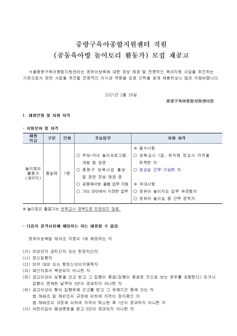 2021-02-26 6558 Áß¶û±¸À°¾ÆÁ¾ÇÕÁö¿ø¼¾ÅÍ Á÷¿ø(°øµ¿À°¾Æ¹æ ³îÀÌÅ丮 Ȱµ¿°¡) ¸ðÁý Àç°ø°í ÷ºÎÆÄÀÏ : 2. ³îÀÌÅ丮 Ȱµ¿°¡ Áö¿ø¼.hwp ÀÌÀü±Û Àå³°¨ ³îÀ̾ÈÀü ½À°ü ´ÙÀ½±Û º½Ã¶ ¾Ë·¹¸£±â ¸ñ·Ï