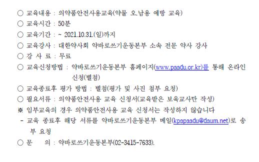 2021-10-07 6409 [´ëÇѾà»çȸ] ÀǾàǰ¾ÈÀü»ç¿ë ±³À° ¾È³» ÷ºÎÆÄÀÏ : [´ë¾à-465] ¡®2021³â ¾à¹Ù¸£°Ô ¾Ë±â Áö¿ø»ç¾÷¡¯ º¸À°±³»ç,¿¹ºñºÎ¸ð(ÀÓºÎ) ´ë»ó ÀǾàǰ¾ÈÀü»ç¿ë±³À° ¾È³».pdf * ÀÚ¼¼ÇÑ ³»¿ëÀº ÷ºÎÆÄÀÏÀ» È®ÀÎÇÏ¿© Áֽñ⠹ٶø´Ï´Ù. ÀÌÀü±Û ¾ÈµÅ¿ä! ½È¾î¿ä! ÇÏÁö ¸¶¼¼¿ä! ´ÙÀ½±Û °øµ¿À°¾Æ¹æ ¹æ¹®ÇÏ´Â »êŸÀÜÄ¡ ¸ñ·Ï