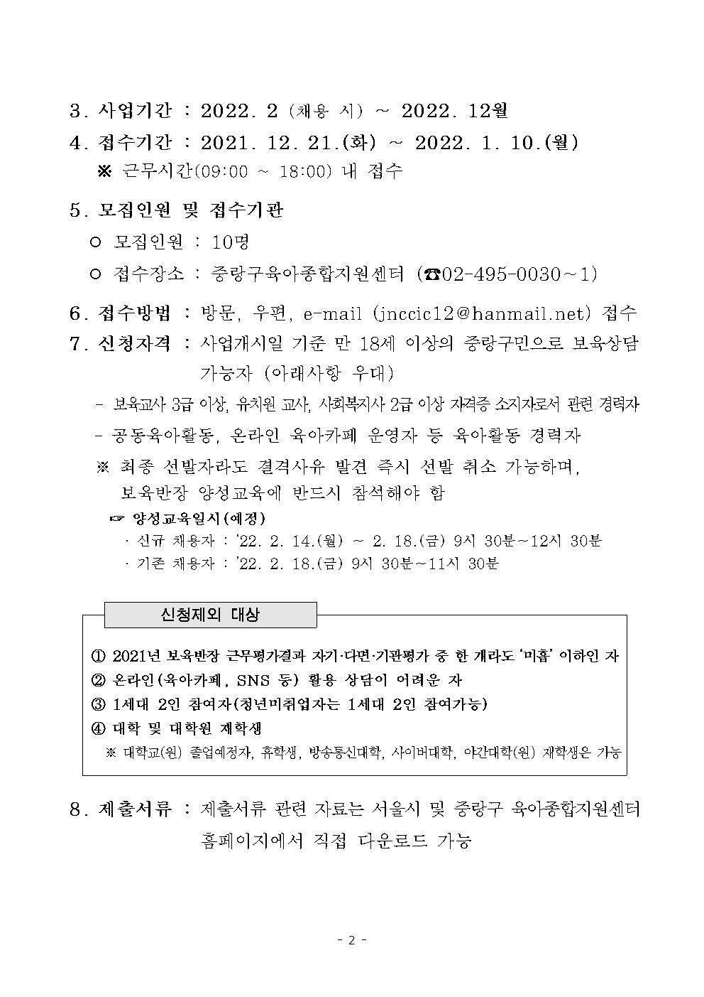 2021-12-21 6643 2022³â ¿ì¸®µ¿³× º¸À°¹ÝÀå»ç¾÷ Âü¿©ÀÚ ¸ðÁý °ø°í ÷ºÎÆÄÀÏ : 2022³â ¿ì¸®µ¿³× º¸À°¹ÝÀå Âü¿©ÀÚ ¸ðÁý Áö¿ø¼·ù.hwp * 'Âü¿©ÀÚ ½Åû¼' ³»¿ë Áß ÀϺΰ¡ º¯°æµÇ¾úÀ¸´Ï Âü°í ¹Ù¶ø´Ï´Ù. (2021.12.29.) 2. °¡Á·°ü°è ³»¿ª ¡æ º¸À°°æÇè ¿©ºÎ ÀÌÀü±Û ¾àÀº ÇԺηΠ¸ÔÁö ¸»°í, ºñŸ¹Îµµ Á¤ÇØÁø ¾ç¸¸ ¸Ô¾î¿ä! ´ÙÀ½±Û ¾Æ¹«°Å³ª ¸¶½ÃÁö ¾Ê¾Æ¿ä ¸ñ·Ï