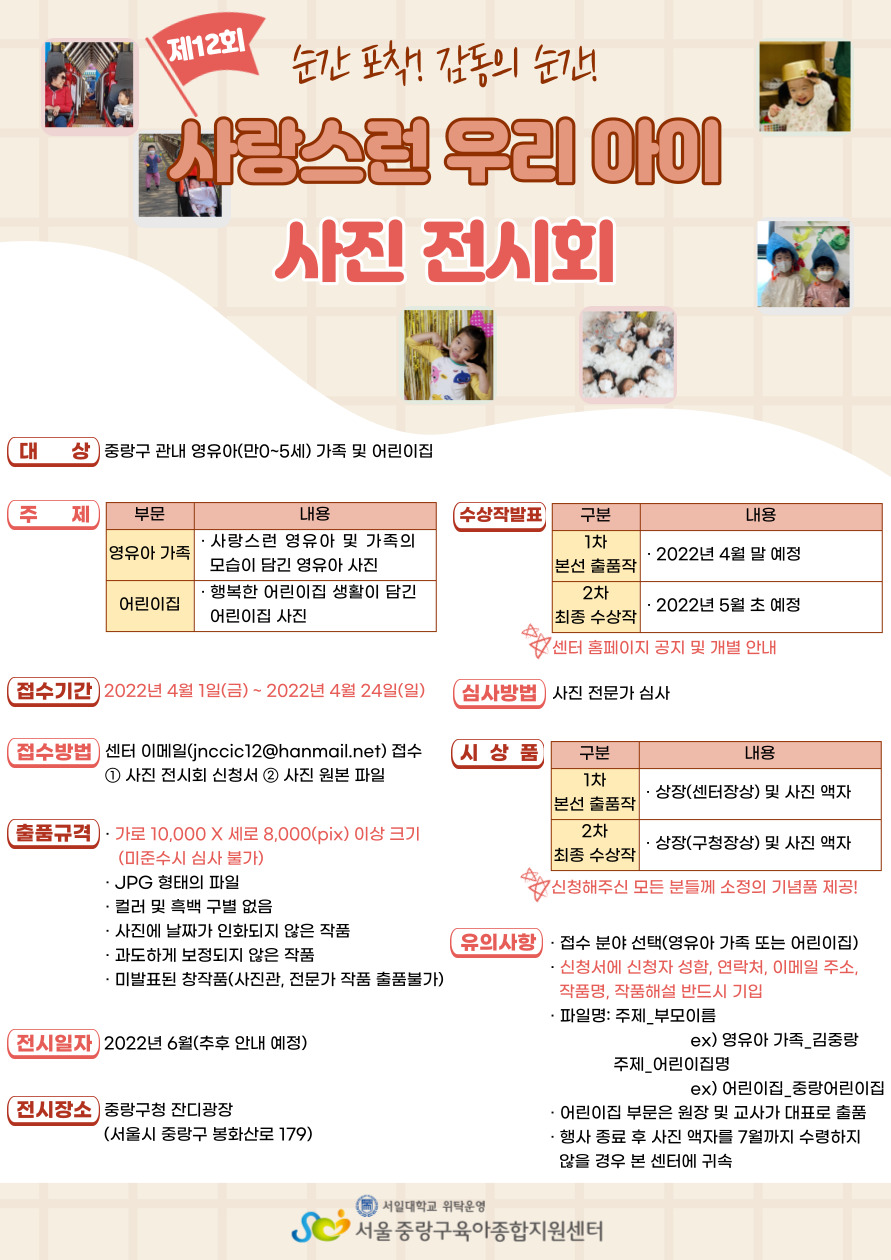 Áß¶û±¸À°¾ÆÁ¾ÇÕÁö¿ø¼¾ÅÍ¿¡¼´Â <Á¦12ȸ »ç¶û½º·± ¿ì¸® ¾ÆÀÌ »çÁø Àü½Ãȸ>¸¦ °³ÃÖÇÕ´Ï´Ù.