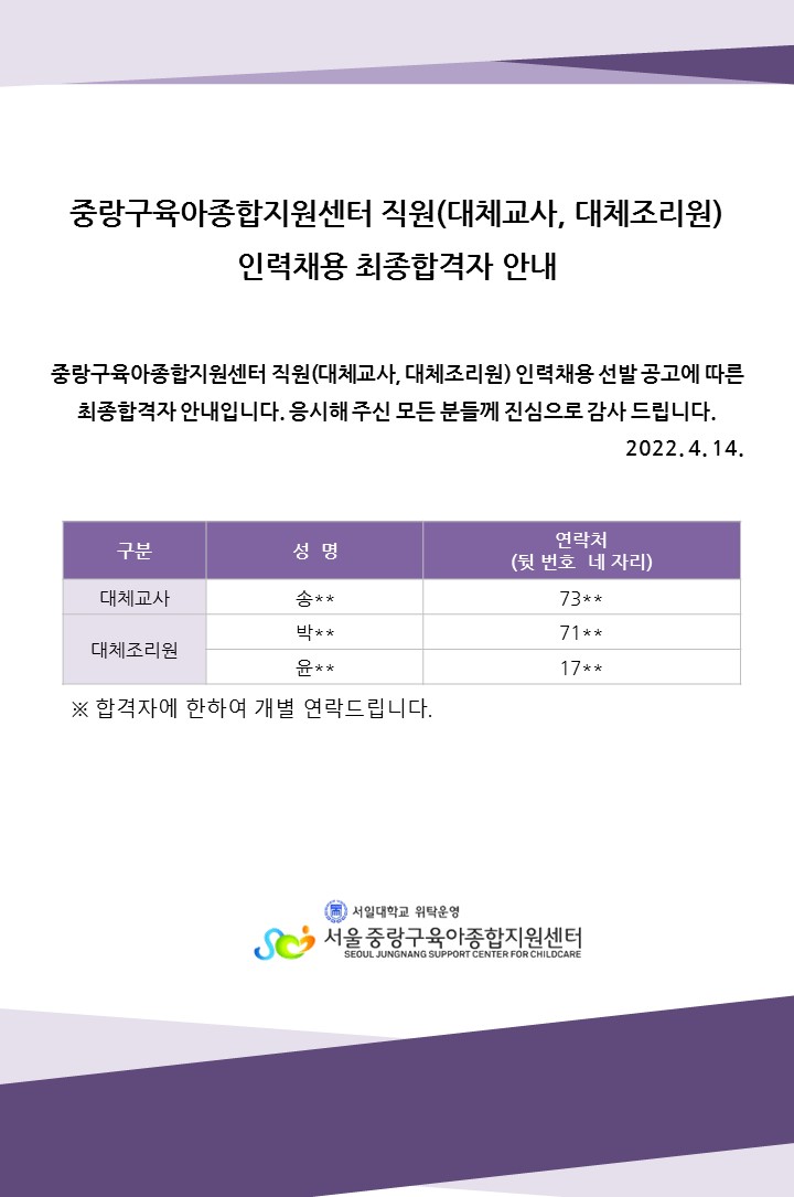 2022-04-14 7347 ´ëüÀηÂ(´ëü±³»ç, ´ëüÁ¶¸®¿ø) ÃÖÁ¾ÇÕ°ÝÀÚ ¾È³» ÀÌÀü±Û ¾Æ¹«°Å³ª ¸¶½ÃÁö ¾Ê¾Æ¿ä ´ÙÀ½±Û 2022 ¾î¸°ÀÌÁý ¿î¿µ»ç·Ê °ø¸ðÀü ½É»ç°á°ú ¾È³» ¸ñ·Ï