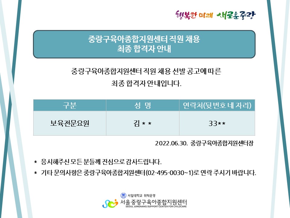 2022-06-30 7281 Áß¶û±¸À°¾ÆÁ¾ÇÕÁö¿ø¼¾ÅÍ º¸À°Àü¹®¿ä¿ø ä¿ë ÃÖÁ¾ ÇÕ°ÝÀÚ ¾È³» ÀÌÀü±Û ¾Æ¹«°Å³ª ¸¶½ÃÁö ¾Ê¾Æ¿ä ´ÙÀ½±Û 2022 ¾î¸°ÀÌÁý ¿î¿µ»ç·Ê °ø¸ðÀü ½É»ç°á°ú ¾È³» ¸ñ·Ï