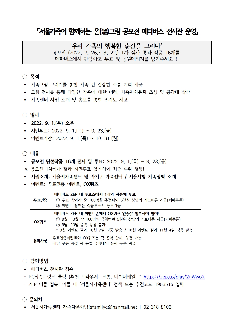 2022-09-06 7653 [¼¿ï½Ã°¡Á·¼¾ÅÍ] ¼¿ï°¡Á·ÀÌ ÇÔ²²ÇÏ´Â ¿Â(è®)±×¸² °ø¸ðÀü ¸ÞŸ¹ö½º Àü½Ã°ü ¿î¿µ ¾È³» ÀÌÀü±Û ¾Æ¹«°Å³ª ¸¶½ÃÁö ¾Ê¾Æ¿ä ´ÙÀ½±Û 2022 ¾î¸°ÀÌÁý ¿î¿µ»ç·Ê °ø¸ðÀü ½É»ç°á°ú ¾È³» ¸ñ·Ï