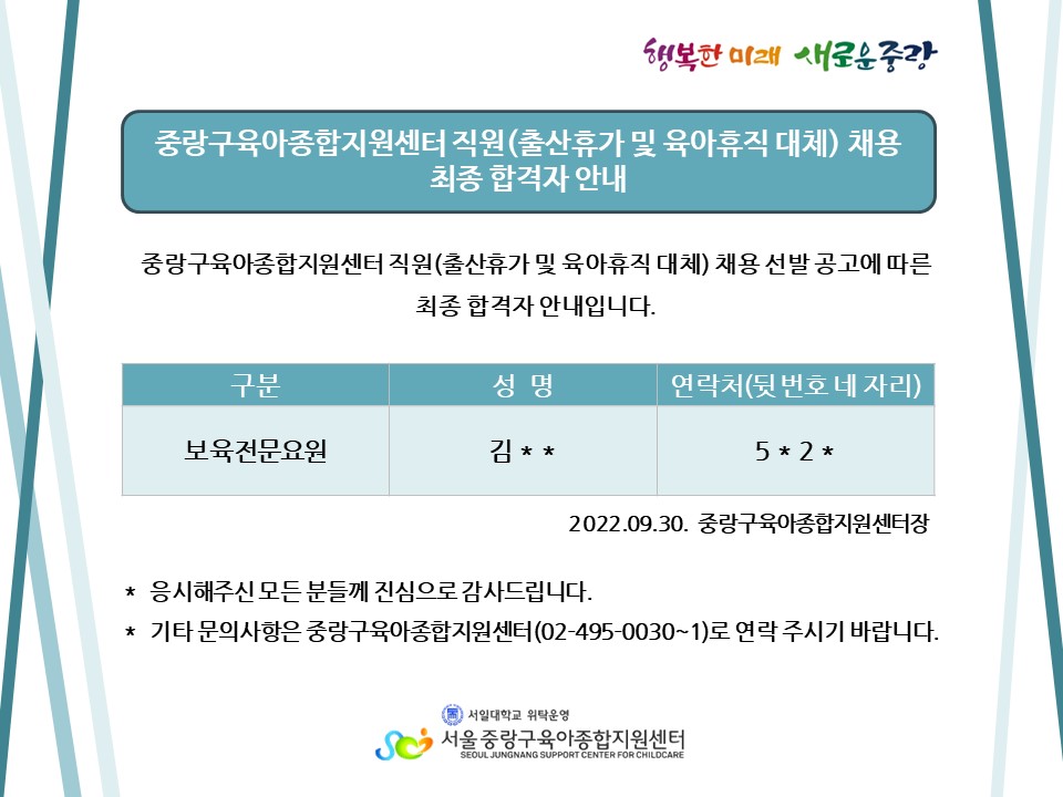 2022-09-30 8195 Áß¶û±¸À°¾ÆÁ¾ÇÕÁö¿ø¼¾ÅÍ Á÷¿ø(Ãâ»êÈÞ°¡ ¹× À°¾ÆÈÞÁ÷ ´ëü) ÀηÂä¿ë ÃÖÁ¾ÇÕ°ÝÀÚ ¾È³» ÀÌÀü±Û ¾Æ¹«°Å³ª ¸¶½ÃÁö ¾Ê¾Æ¿ä ´ÙÀ½±Û 2022 ¾î¸°ÀÌÁý ¿î¿µ»ç·Ê °ø¸ðÀü ½É»ç°á°ú ¾È³» ¸ñ·Ï