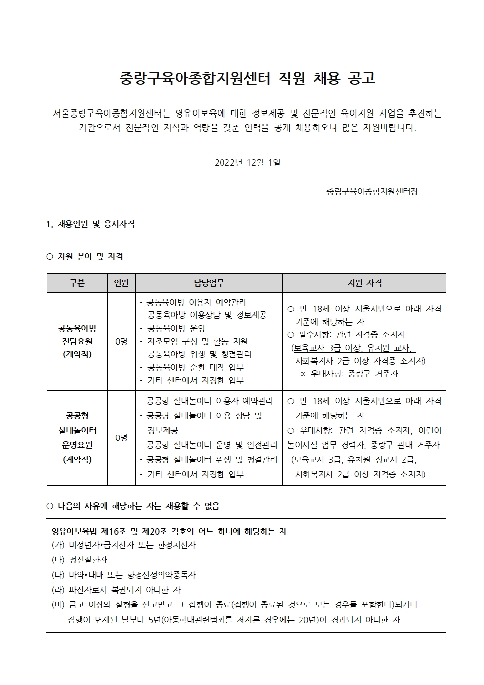 2022-12-01 7920 Áß¶û±¸À°¾ÆÁ¾ÇÕÁö¿ø¼¾ÅÍ Á÷¿ø(°øµ¿À°¾Æ¹æ Àü´ã¿ä¿ø, ½Ç³»³îÀÌÅÍ ¿î¿µ¿ä¿ø) ä¿ë °ø°í ÷ºÎÆÄÀÏ : Áß¶û±¸À°¾ÆÁ¾ÇÕÁö¿ø¼¾ÅÍ ÀÔ»ç Áö¿ø¼.hwp ÀÌÀü±Û 2022 ¾î¸°ÀÌÁý ¿î¿µ»ç·Ê °ø¸ðÀü ½É»ç°á°ú ¾È³» ´ÙÀ½±Û Áß¶û±¸À°¾ÆÁ¾ÇÕÁö¿ø¼¾ÅÍ Á÷¿ø(½Ã°£Á¦º¸À° ±³»ç) ¼·ùÀüÇü ÇÕ°ÝÀÚ ¾È³» ¸ñ·Ï