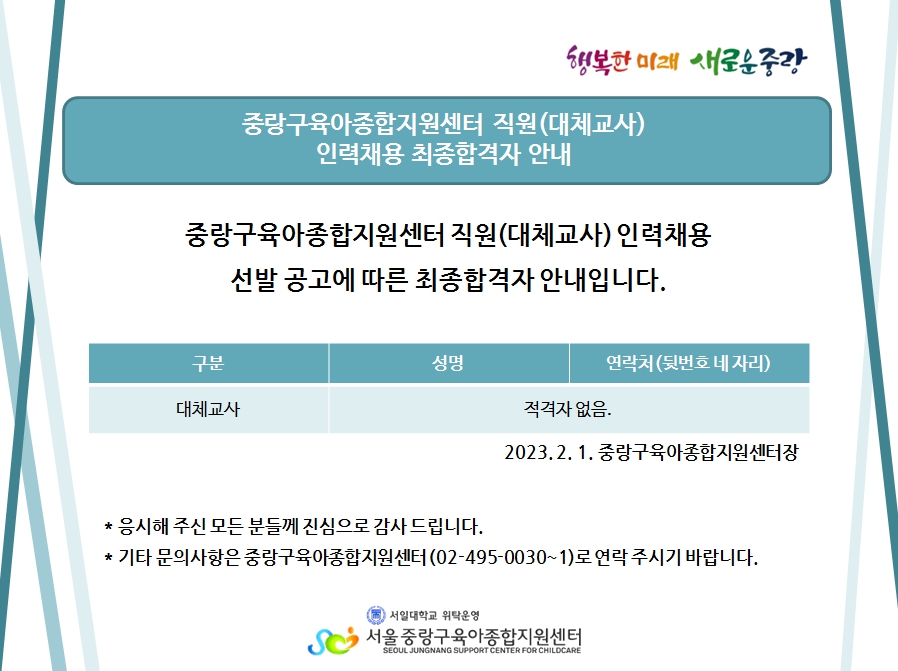 2023-02-01 7558 Áß¶û±¸À°¾ÆÁ¾ÇÕÁö¿ø¼¾ÅÍ Á÷¿ø(´ëü±³»ç) ÃÖÁ¾ÇÕ°ÝÀÚ ¾È³» ÀÌÀü±Û 2022 ¾î¸°ÀÌÁý ¿î¿µ»ç·Ê °ø¸ðÀü ½É»ç°á°ú ¾È³» ´ÙÀ½±Û Áß¶û±¸À°¾ÆÁ¾ÇÕÁö¿ø¼¾ÅÍ Á÷¿ø(½Ã°£Á¦º¸À° ±³»ç) ¼·ùÀüÇü ÇÕ°ÝÀÚ ¾È³» ¸ñ·Ï