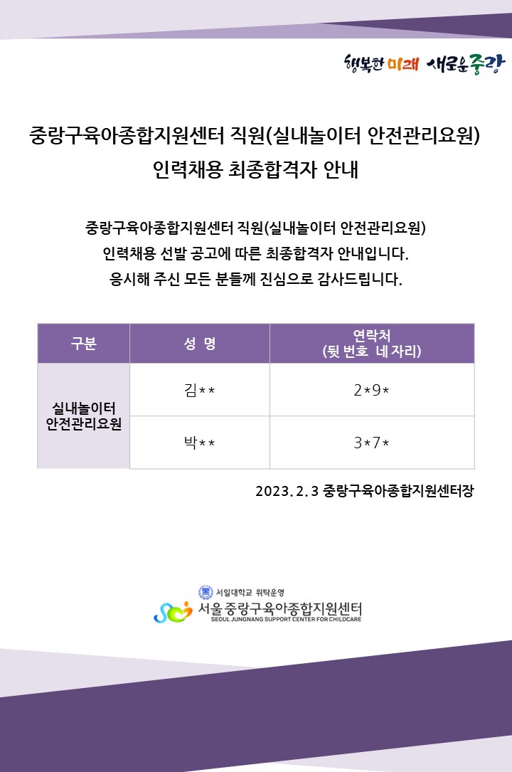 2023-02-03 7744 Áß¶û±¸À°¾ÆÁ¾ÇÕÁö¿ø¼¾ÅÍ Á÷¿ø(½Ç³»³îÀÌÅÍ ¾ÈÀü°ü¸®¿ä¿ø) ÃÖÁ¾ÇÕ°ÝÀÚ ¾È³» ÀÌÀü±Û 2022 ¾î¸°ÀÌÁý ¿î¿µ»ç·Ê °ø¸ðÀü ½É»ç°á°ú ¾È³» ´ÙÀ½±Û Áß¶û±¸À°¾ÆÁ¾ÇÕÁö¿ø¼¾ÅÍ Á÷¿ø(½Ã°£Á¦º¸À° ±³»ç) ¼·ùÀüÇü ÇÕ°ÝÀÚ ¾È³» ¸ñ·Ï