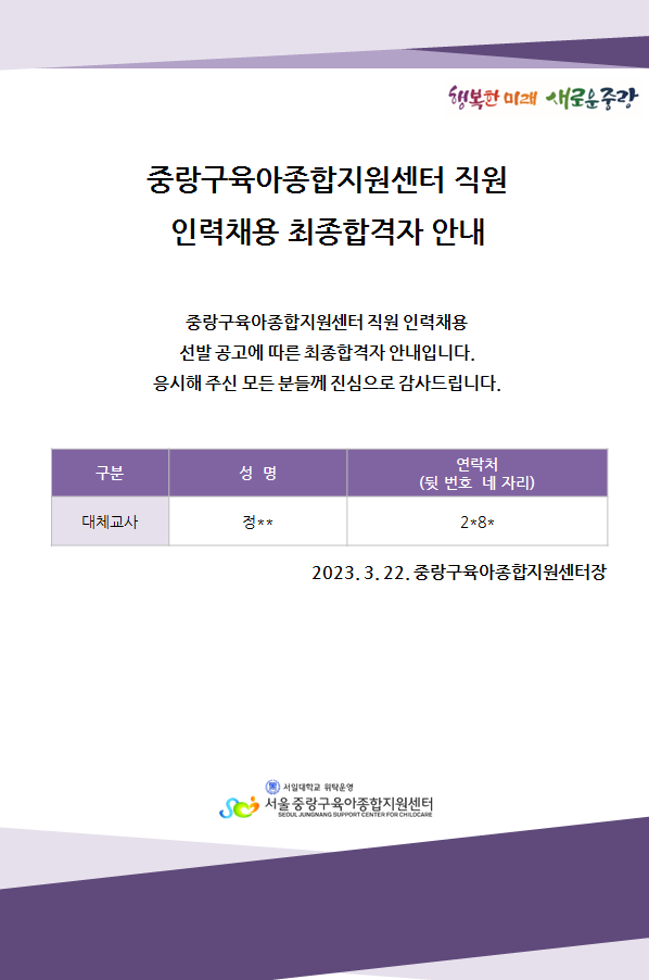 2023-03-22 8570 Áß¶û±¸À°¾ÆÁ¾ÇÕÁö¿ø¼¾ÅÍ Á÷¿ø(´ëü±³»ç) ÃÖÁ¾ÇÕ°ÝÀÚ ¾È³» ÀÌÀü±Û Áß¶û±¸À°¾ÆÁ¾ÇÕÁö¿ø¼¾ÅÍ Á÷¿ø(½Ã°£Á¦º¸À° ±³»ç) ¼·ùÀüÇü ÇÕ°ÝÀÚ ¾È³» ´ÙÀ½±Û ¿ì¸® ¾î¸°À̵µ »ý¸íÀ» ±¸ÇÒ ¼ö ÀÖ¾î¿ä! ¸ñ·Ï