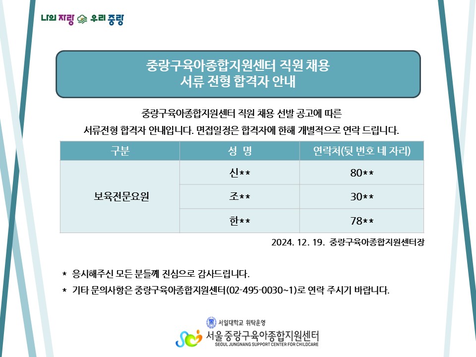 2024-12-19 6466 Áß¶û±¸À°¾ÆÁ¾ÇÕÁö¿ø¼¾ÅÍ Á÷¿ø(º¸À°Àü¹®¿ä¿ø)¼·ùÀüÇü ÇÕ°ÝÀÚ ¾È³» ÀÌÀü±Û [ÃæÃ»Åõµ¥ÀÌ] ¿µÀ¯¾Æ¿¡ Ä¡¸íÀû ¡®¹éÀÏÇØ¡¯ À¯Çࡦ ¿¹¹æÁ¢Á¾¡¤¸¶½ºÅ© Âø¿ëÀÌ ÃÖ¼± ¸ñ·Ï