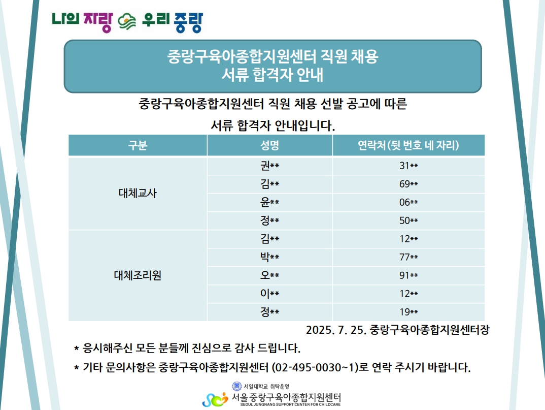 2025-07-25 10537 Áß¶û±¸À°¾ÆÁ¾ÇÕÁö¿ø¼¾ÅÍ Á÷¿ø(´ëü±³»ç,´ëüÁ¶¸®¿ø) ¼·ù ÇÕ°ÝÀÚ ¾È³» ÀÌÀü±Û [ÃæÃ»Åõµ¥ÀÌ] ¿µÀ¯¾Æ¿¡ Ä¡¸íÀû ¡®¹éÀÏÇØ¡¯ À¯Çࡦ ¿¹¹æÁ¢Á¾¡¤¸¶½ºÅ© Âø¿ëÀÌ ÃÖ¼± ¸ñ·Ï