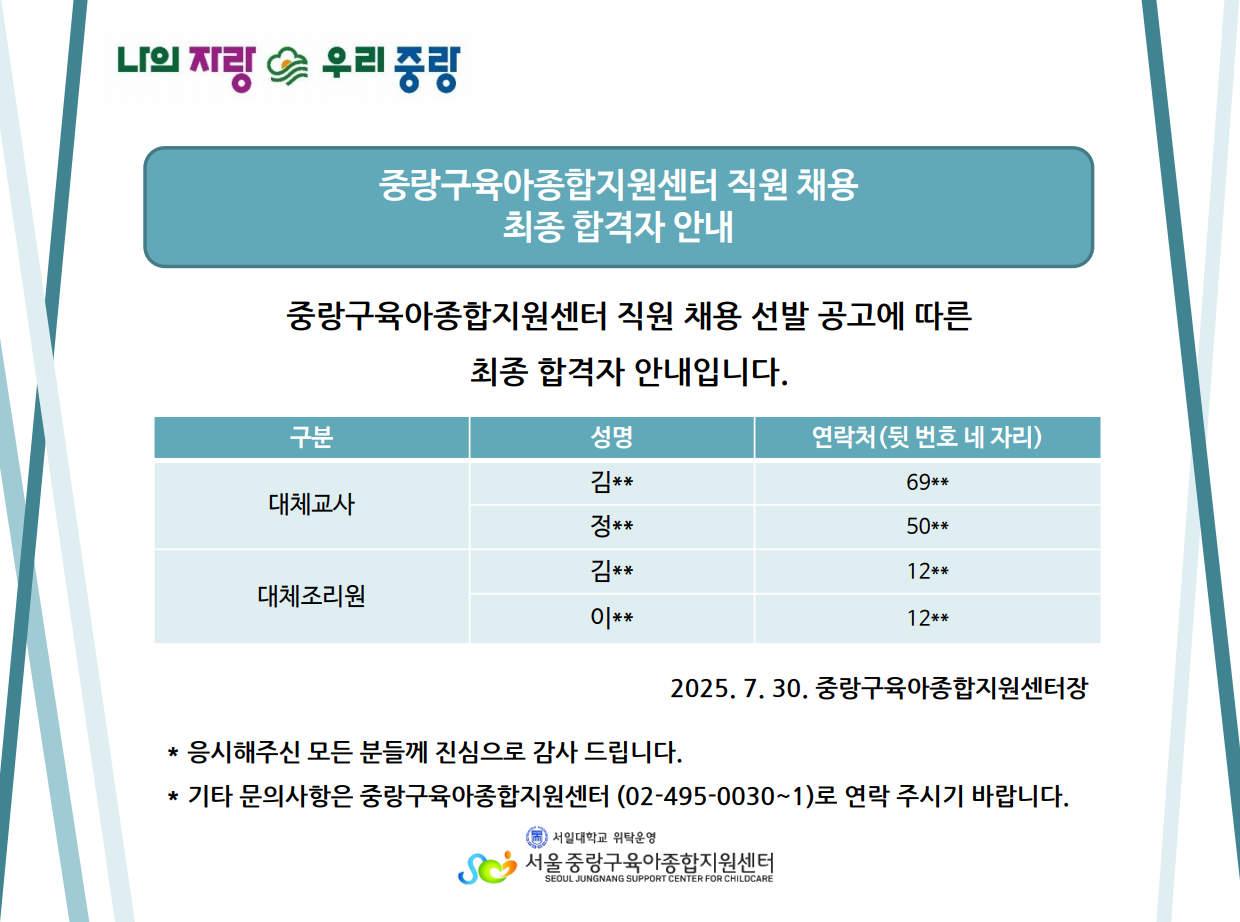 2025-07-30 9556 Áß¶û±¸À°¾ÆÁ¾ÇÕÁö¿ø¼¾ÅÍ Á÷¿ø(´ëü±³»ç, ´ëüÁ¶¸®¿ø) ÃÖÁ¾ ÇÕ°ÝÀÚ ¾È³» ÀÌÀü±Û [ÃæÃ»Åõµ¥ÀÌ] ¿µÀ¯¾Æ¿¡ Ä¡¸íÀû ¡®¹éÀÏÇØ¡¯ À¯Çࡦ ¿¹¹æÁ¢Á¾¡¤¸¶½ºÅ© Âø¿ëÀÌ ÃÖ¼± ¸ñ·Ï