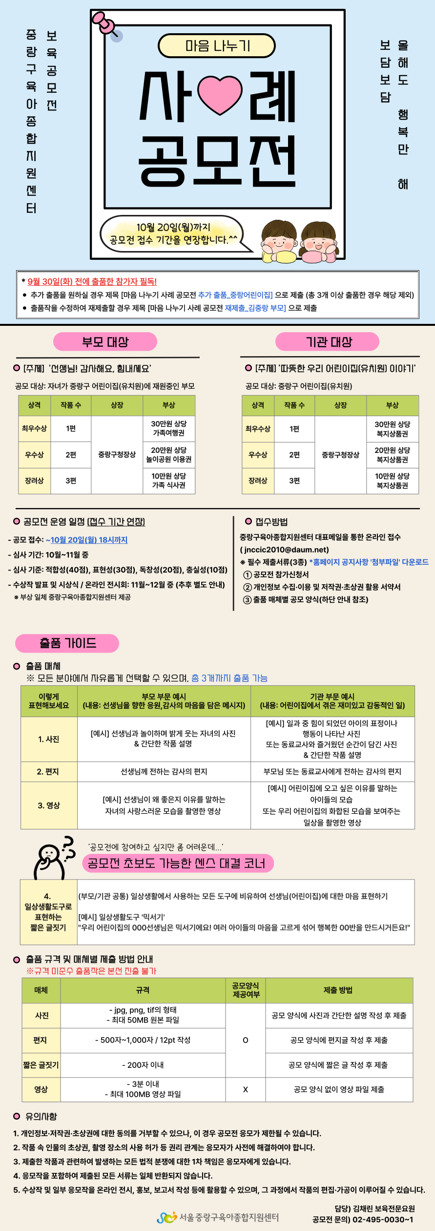 2025-10-01 6479 2025³â ¸¶À½ ³ª´©±â »ç·Ê °ø¸ðÀü Á¢¼ö±â°£ ¿¬Àå ¾È³» ÷ºÎÆÄÀÏ : [Áß¶û±¸À°¾ÆÁ¾ÇÕÁö¿ø¼¾ÅÍ] ¸¶À½ ³ª´©±â »ç·Ê °ø¸ðÀü Á¢¼ö ±â°£ ¿¬Àå Æ÷½ºÅÍ.png [±â°ü¿ë] ¸¶À½ ³ª´©±â »ç·Ê °ø¸ðÀü Á¦Ãâ¼·ù.hwp [ºÎ¸ð¿ë] ¸¶À½ ³ª´©±â »ç·Ê °ø¸ðÀü Á¦Ãâ¼·ù.hwp ÀÌÀü±Û [ÃæÃ»Åõµ¥ÀÌ] ¿µÀ¯¾Æ¿¡ Ä¡¸íÀû ¡®¹éÀÏÇØ¡¯ À¯Çࡦ ¿¹¹æÁ¢Á¾¡¤¸¶½ºÅ© Âø¿ëÀÌ ÃÖ¼± ¸ñ·Ï