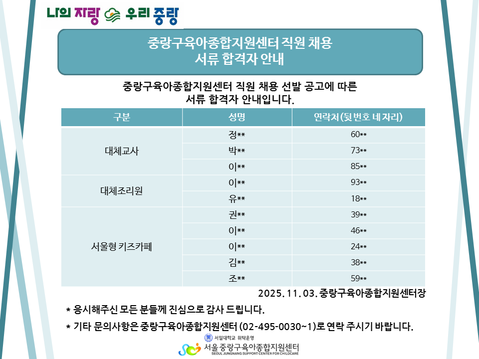 2025-11-03 690 Áß¶û±¸À°¾ÆÁ¾ÇÕÁö¿ø¼¾ÅÍ Á÷¿ø(´ëü±³»ç, ´ëüÁ¶¸®¿ø, ¼¿ïÇü ŰÁîÄ«Æä) ¼·ù ÇÕ°ÝÀÚ ¾È³» ÀÌÀü±Û [ÃæÃ»Åõµ¥ÀÌ] ¿µÀ¯¾Æ¿¡ Ä¡¸íÀû ¡®¹éÀÏÇØ¡¯ À¯Çࡦ ¿¹¹æÁ¢Á¾¡¤¸¶½ºÅ© Âø¿ëÀÌ ÃÖ¼± ¸ñ·Ï