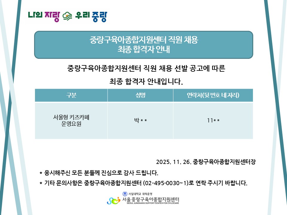 2025-11-26 246 Áß¶û±¸À°¾ÆÁ¾ÇÕÁö¿ø¼¾ÅÍ Á÷¿ø(¼¿ïÇü ŰÁîÄ«Æä ¿î¿µ¿ä¿ø) ÃÖÁ¾ ÇÕ°ÝÀÚ ¾È³» ÀÌÀü±Û [ÃæÃ»Åõµ¥ÀÌ] ¿µÀ¯¾Æ¿¡ Ä¡¸íÀû ¡®¹éÀÏÇØ¡¯ À¯Çࡦ ¿¹¹æÁ¢Á¾¡¤¸¶½ºÅ© Âø¿ëÀÌ ÃÖ¼± ¸ñ·Ï