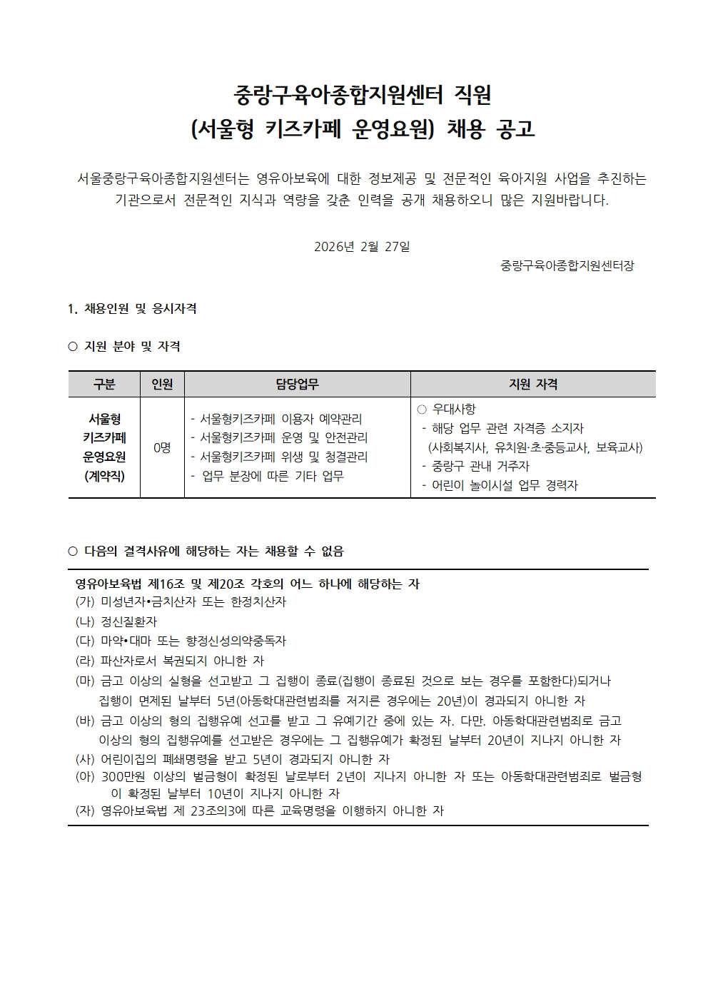 2026-02-27 118 [Áß¶û±¸À°¾ÆÁ¾ÇÕÁö¿ø¼¾ÅÍ] Á÷¿ø(¼¿ïÇüŰÁîÄ«Æä ¿î¿µ¿ä¿ø) ä¿ë °ø°í ÷ºÎÆÄÀÏ : Áß¶û±¸À°¾ÆÁ¾ÇÕÁö¿ø¼¾ÅÍ(¼¿ïÇüŰÁîÄ«Æä ¿î¿µ¿ä¿ø) ÀÔ»çÁö¿ø¼.hwp ÀÌÀü±Û [ÃæÃ»Åõµ¥ÀÌ] ¿µÀ¯¾Æ¿¡ Ä¡¸íÀû ¡®¹éÀÏÇØ¡¯ À¯Çࡦ ¿¹¹æÁ¢Á¾¡¤¸¶½ºÅ© Âø¿ëÀÌ ÃÖ¼± ¸ñ·Ï