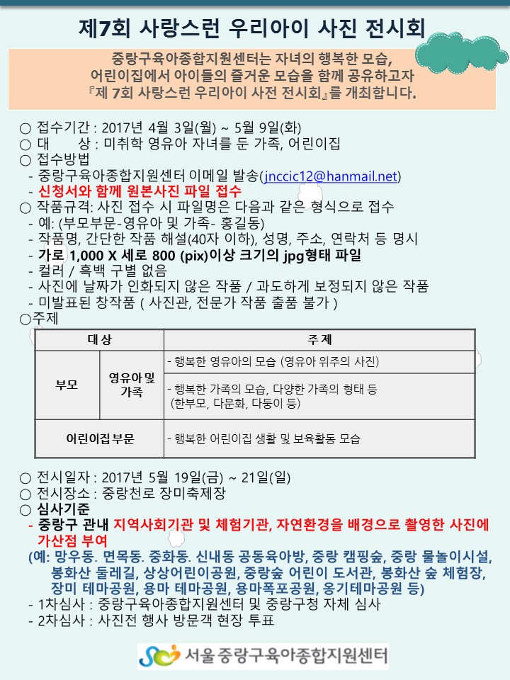 2017-03-31 12278 2017³â Á¦7ȸ »ç¶û½º·± ¿ì¸®¾ÆÀÌ »çÁøÀü½Ãȸ °³ÃÖ ¾È³» ÷ºÎÆÄÀÏ : 2017 »çÁø Àü½Ãȸ ½Åû¼.hwp ´ÙÀ½±Û »óºÀŰ¿ò °øµ¿À°¾Æ¹æ °³¼Ò ¾È³» ¸ñ·Ï