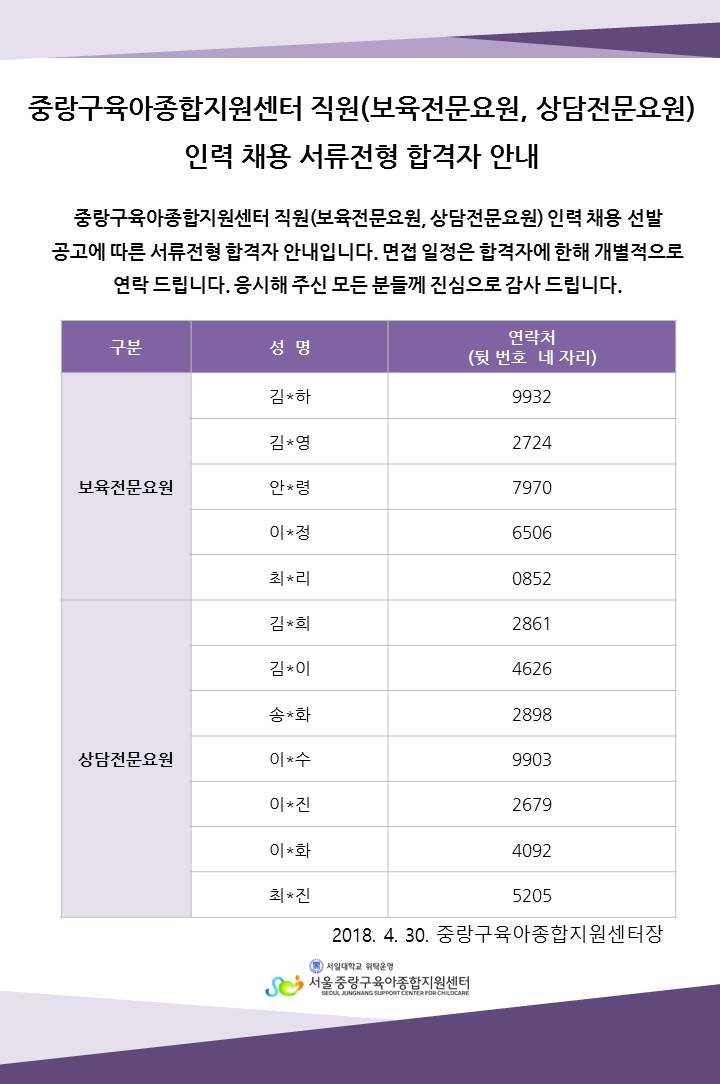2018-04-30 13783 2018³â Áß¶û±¸À°¾ÆÁ¾ÇÕÁö¿ø¼¾ÅÍ Á÷¿ø(º¸À°Àü¹®¿ä¿ø, »ó´ãÀü¹®¿ä¿ø) ¼·ù ÇÕ°ÝÀÚ ¾È³» ÀÌÀü±Û »óºÀŰ¿ò °øµ¿À°¾Æ¹æ °³¼Ò ¾È³» ´ÙÀ½±Û Æò°¡Á¦ °á°ú¹ßÇ¥(11¿ù) ¸ñ·Ï