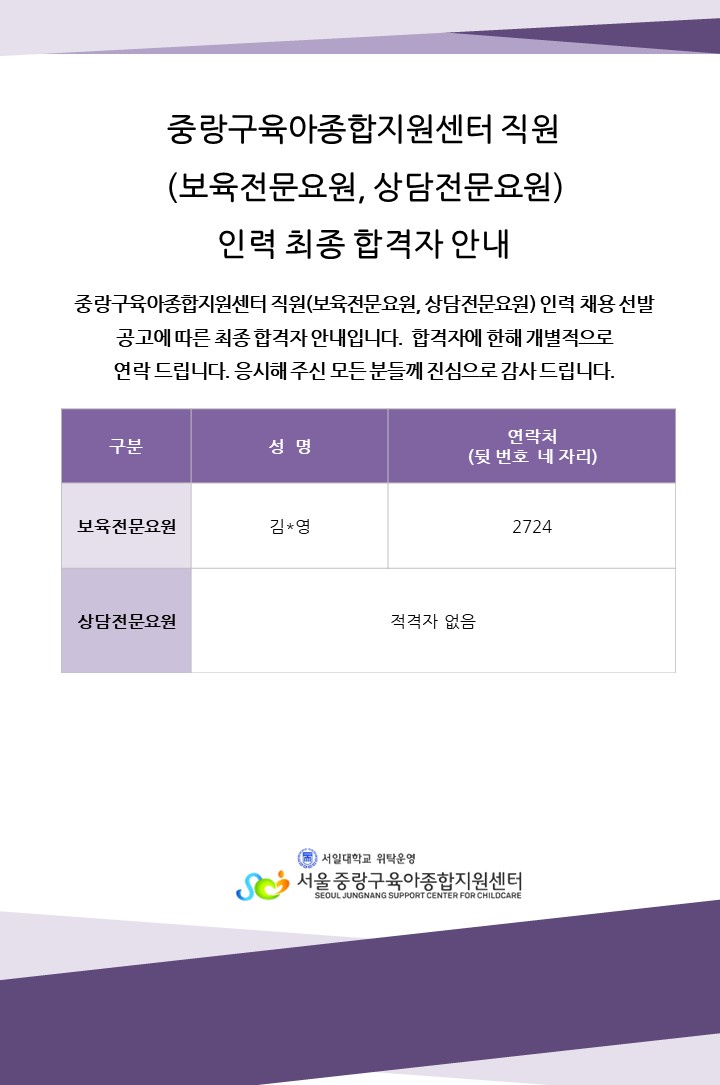 2018-05-04 10757 Áß¶û±¸À°¾ÆÁ¾ÇÕÁö¿ø¼¾ÅÍ Á÷¿ø(º¸À°Àü¹®¿ä¿ø, »ó´ãÀü¹®¿ä¿ø) ÃÖÁ¾ÇÕ°ÝÀÚ ¾È³» ÀÌÀü±Û »óºÀŰ¿ò °øµ¿À°¾Æ¹æ °³¼Ò ¾È³» ´ÙÀ½±Û Æò°¡Á¦ °á°ú¹ßÇ¥(11¿ù) ¸ñ·Ï
