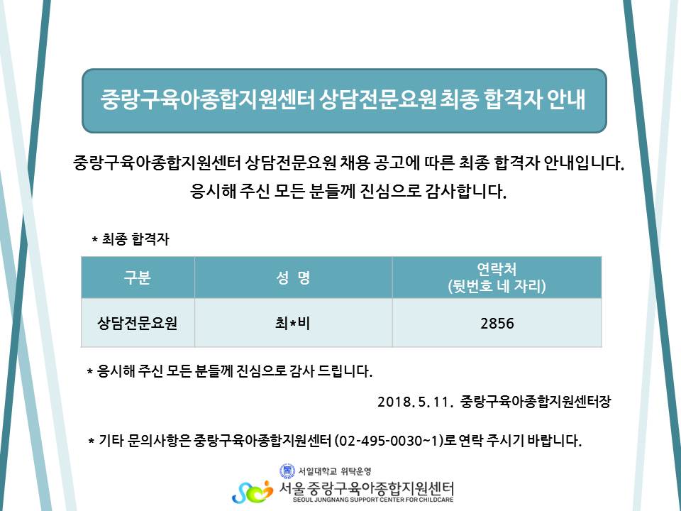 2018-05-11 7547 Áß¶û±¸À°¾ÆÁ¾ÇÕÁö¿ø¼¾ÅÍ »ó´ãÀü¹®¿ä¿ø ÃÖÁ¾ ÇÕ°ÝÀÚ ¾È³» ÀÌÀü±Û »óºÀŰ¿ò °øµ¿À°¾Æ¹æ °³¼Ò ¾È³» ´ÙÀ½±Û Æò°¡Á¦ °á°ú¹ßÇ¥(11¿ù) ¸ñ·Ï