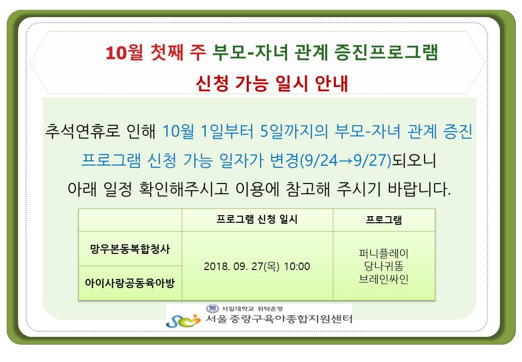 2018-09-17 6443 10¿ù ù° ÁÖ ºÎ¸ð-ÀÚ³à °ü°è ÁõÁøÇÁ·Î±×·¥ ½Åû °¡´É ÀϽà ¾È³» ÀÌÀü±Û »óºÀŰ¿ò °øµ¿À°¾Æ¹æ °³¼Ò ¾È³» ´ÙÀ½±Û Æò°¡Á¦ °á°ú¹ßÇ¥(11¿ù) ¸ñ·Ï
