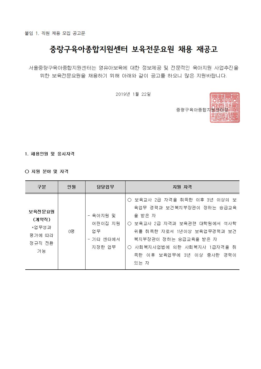 2019-01-22 6910 º¸À°Àü¹®¿ä¿ø ä¿ë Àç°ø°í ÷ºÎÆÄÀÏ : ºÙÀÓ2. Áß¶û±¸À°¾ÆÁ¾ÇÕÁö¿ø¼¾ÅÍ ÀÔ»ç Áö¿ø¼.hwp ÀÌÀü±Û »óºÀŰ¿ò °øµ¿À°¾Æ¹æ °³¼Ò ¾È³» ´ÙÀ½±Û Æò°¡Á¦ °á°ú¹ßÇ¥(11¿ù) ¸ñ·Ï