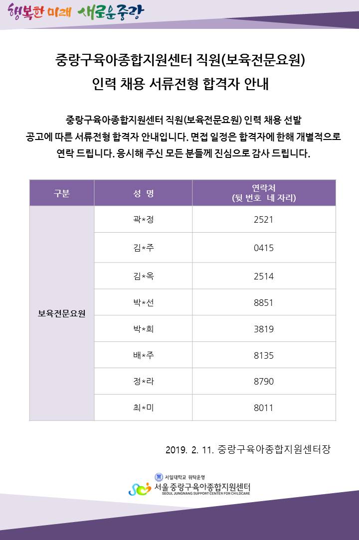 2019-02-11 6237 Áß¶û±¸À°¾ÆÁ¾ÇÕÁö¿ø¼¾ÅÍ Á÷¿ø(º¸À°Àü¹®¿ä¿ø) Àη ä¿ë ¼·ùÀüÇü ÇÕ°ÝÀÚ ¾È³» ÀÌÀü±Û »óºÀŰ¿ò °øµ¿À°¾Æ¹æ °³¼Ò ¾È³» ´ÙÀ½±Û Æò°¡Á¦ °á°ú¹ßÇ¥(11¿ù) ¸ñ·Ï
